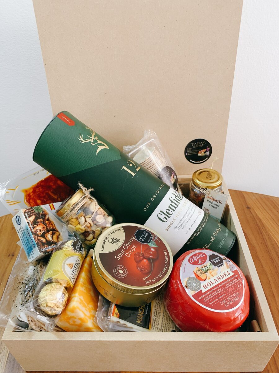 Presentado en una caja de madera con tapa (30×30 cm), con detalles elegantes, sticker de marca y opción de mensaje personalizado. Cada elemento está cuidadosamente dispuesto para reflejar el buen gusto y la exclusividad.